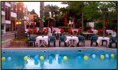 فهي علي حديقة مساحتها حوالي 3500 متر مربع تقدم جميع المشروبات الباردة و الساخنة سواء بالحديقة أو حول حمامات السباحة